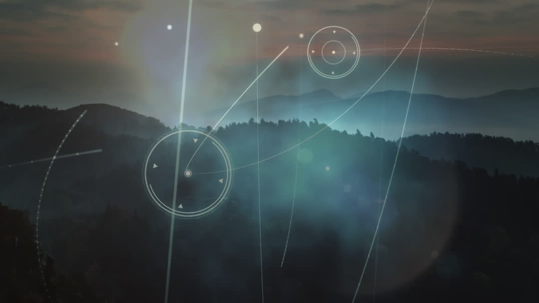 This video portrays a landscape of dark, wooded mountains shrouded in mist at dusk. Overlaid are digital, technological elements depicting a network of connections, suggesting themes of data processing and global connectivity. This visual can be effectively used in presentations or designs emphasizing technology in nature, promoting innovative solutions or exploring abstract ideas where digital meets physical environments.