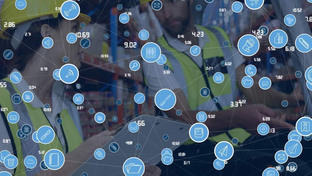 Dynamic overlay of digital network icons showing technology integration in a warehouse environment. Diverse workers participate in managing inventory using digital tools, symbolizing global connectivity and modern logistics. Useful for illustrating technology's role in business operations, management training, and industry digitalization.