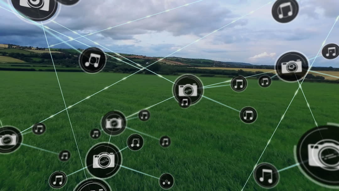 Digital symbols including music note and camera icon virtually connect across a rolling green landscape. Lines interlink each icon creating an audiovisual network concept. Suitable for depicting ideas related to digital communication, multimedia integration, futuristic technology or environmental consideration in media networks.