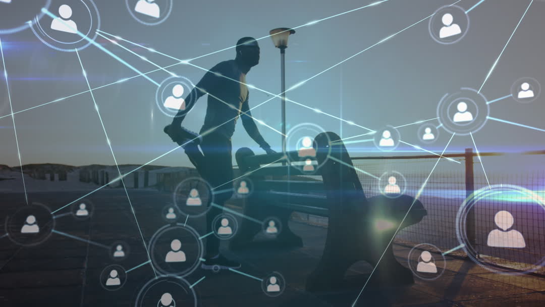 Illustrating the intersection of technology and fitness, digital connections overlay on an African American man performing stretches by the promenade. This concept combines the themes of active lifestyle and digital connectivity. Suitable for illustrating topics related to health tech, wearable fitness devices, or social media fitness communities.