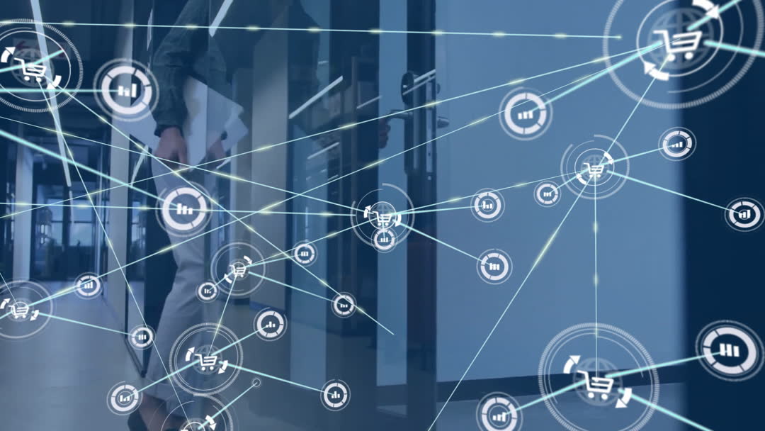 A businesswoman walking in an office corridor is overlaid with digital network graphics, featuring icons for data, communications, and online interactions. The video can be used to illustrate concepts of global business communication, digital networks, technological connections, or innovations in an office setting. Suitable for marketing, promotional materials, or presentations related to technology or corporate enterprises.