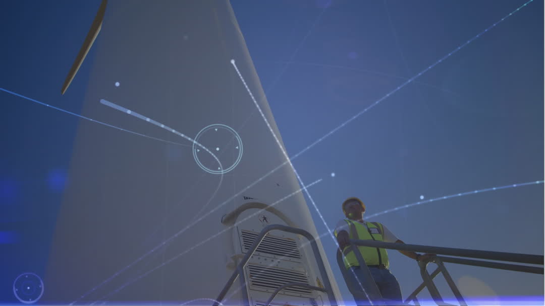Digital Network Overlays on Engineer by Wind Turbine Video