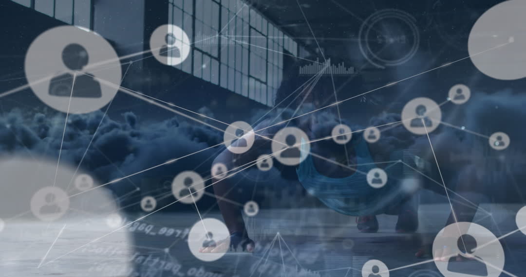 The scene creatively combines a network visualization with an African American woman during her workout in a gym setting. Inspirational for themes of global digital connectivity intersecting with physical fitness, this video is useful for promoting innovative fitness solutions, global communications technologies, or digital transformation where exercise represents vitality in a modern digital world.