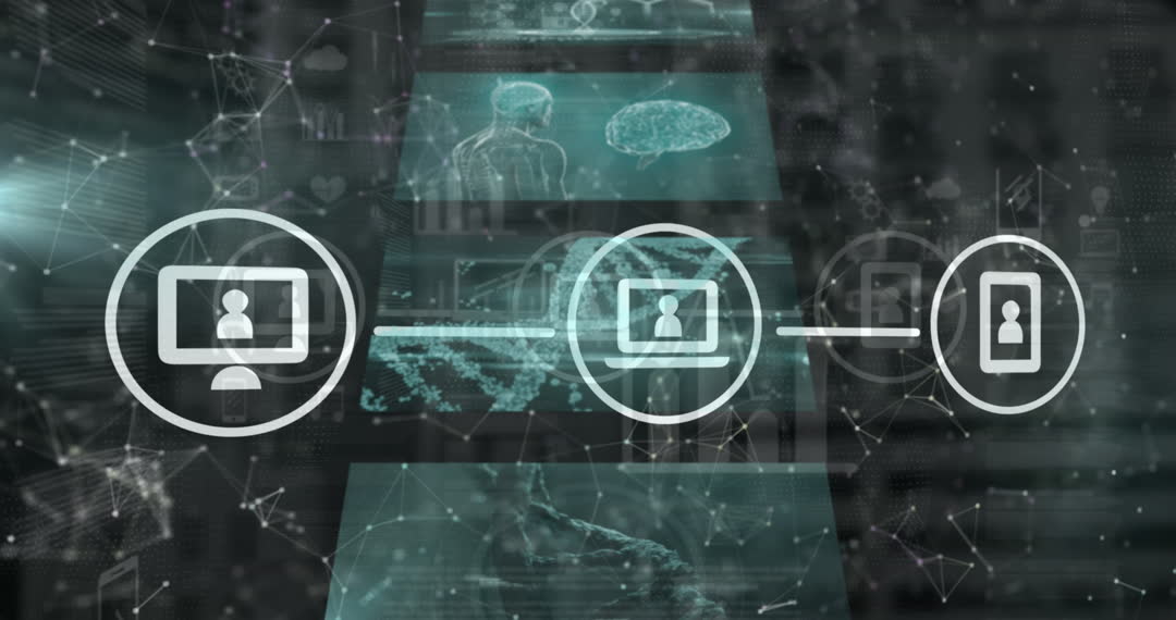 Visualizes concepts of online connectivity and digital processing through icons and scientific data overlay on screens. Ideal for content related to AI technology, modern computing systems, data analysis, and global network solutions. Effective for educational purposes, tech company websites, and innovation presentations.