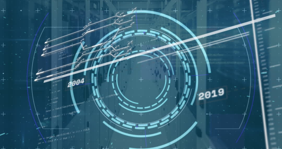 Digital interface indicating connection pathways, overlaid with a circular scanning target, shows technological progression from 2004 to 2019, making it suitable for presentations on technological growth or network advancements.