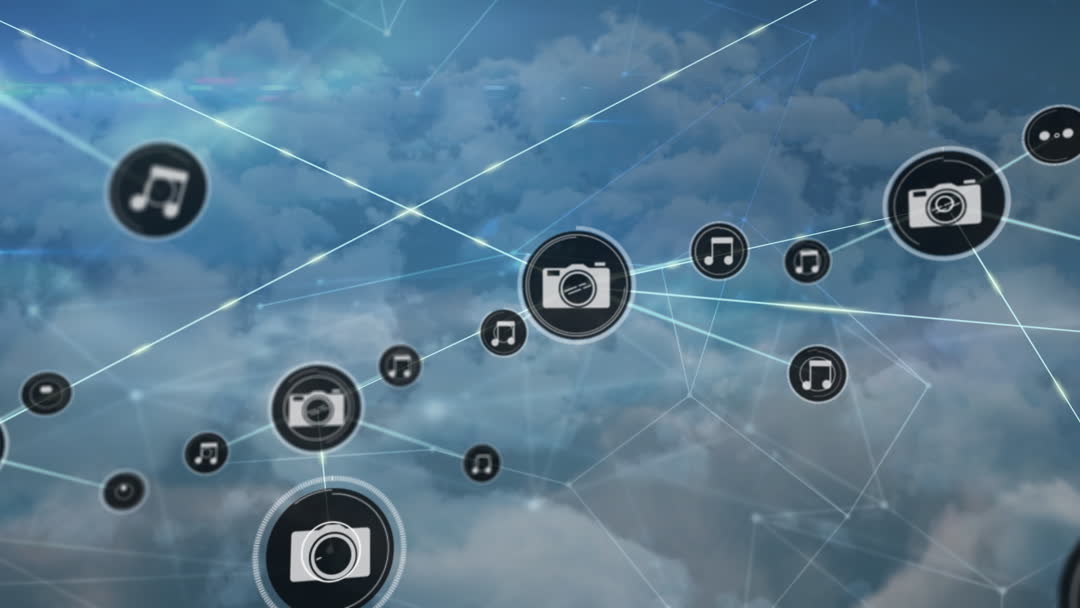 Visual representation of digital connectivity concepts using iconography overlaid on clouds, symbolizing cloud computing and storage. Suitable for use in technology publications, presentations on digital media solutions, websites explaining cloud services, and modern tech events promo material.