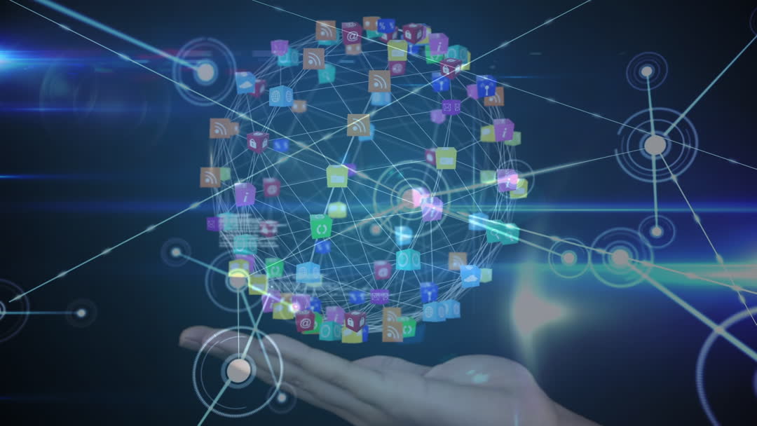 Sphere made of diverse digital icons and symbols connected over an open hand, illustrating global network connectivity. Modern and futuristic theme suggesting technology and data exchange. Useful for presentations on digital innovation, concepts of connectivity, or Internet technologies.