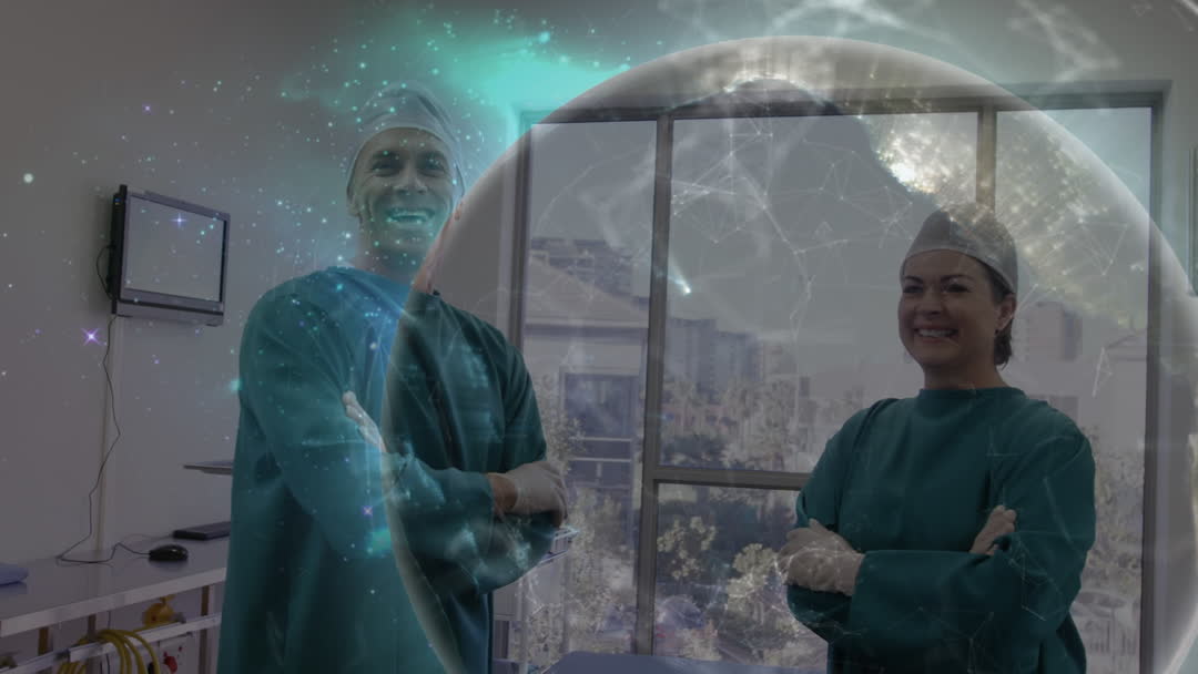 Surgeons are pictured discussing advancements in global medical technology, illustrated through a digital overlay of network connections and globe. This video can be used for promoting modern medical innovations, educational content on healthcare technology, or illustrating future trends in global digital health communication.