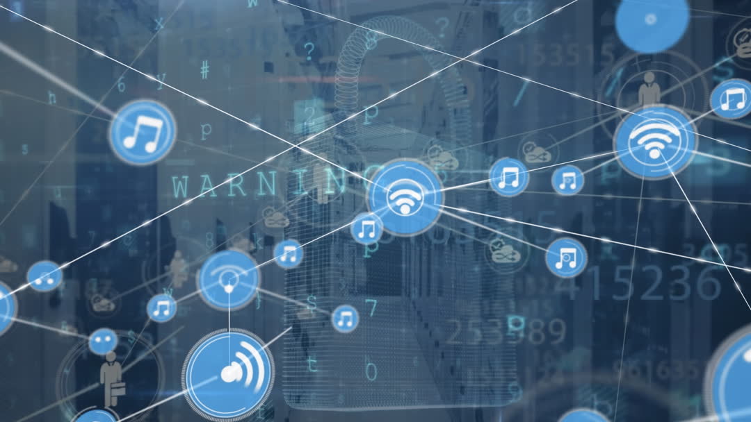 Abstract representation of a digital network illustrating interconnected data via various icons such as wireless, warning, and media symbols. Set against the backdrop of computer servers, it conveys concepts of modern technology, security, network operations, and global communication. Suitable for use in technology presentations, cybersecurity articles, or illustrating concepts of information technology and data management.