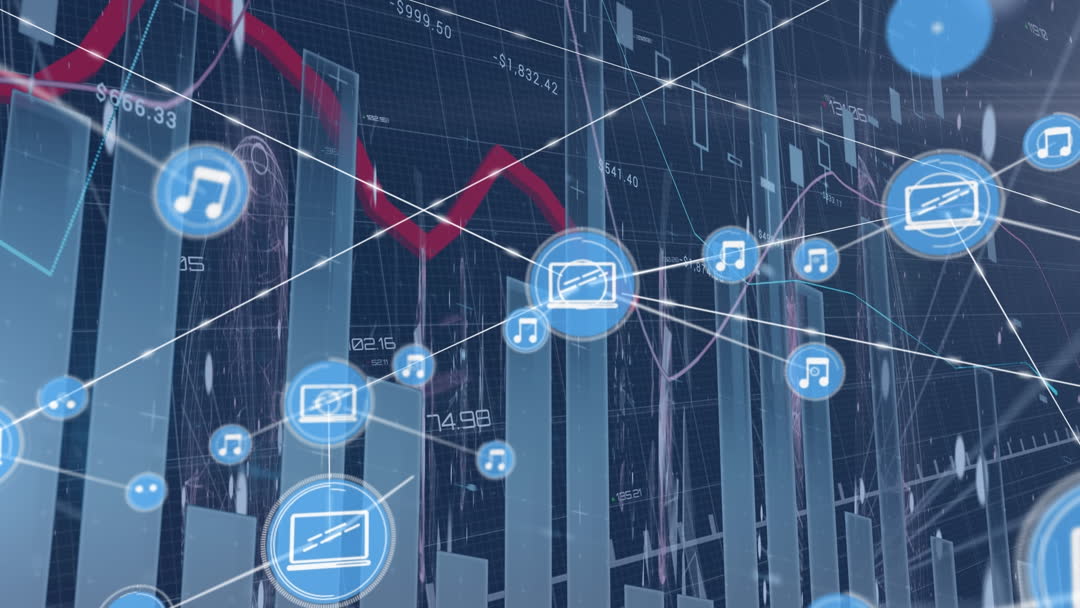 This visual presents a digitally-animated network of computing and music icons against a dynamic backdrop of data analytics, including graphs and numerical elements. Valuable for illustrating concepts related to technology, digital communication, big data analysis, and modern networking in presentations, articles, or website content. Effective for academic or corporate settings discussing data integration and technological advancements.