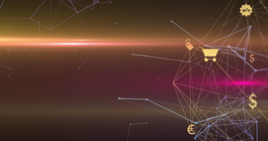 Abstract background displays digital network of connections intertwined with financial symbols like currencies and commerce icons, showcasing relationship between technology and global finance. Explores themes of innovation, data exchange, and the digital marketplace. Great for illustrating concepts of online business, trading ideas, financial growth, and technological advancements in economic domains.