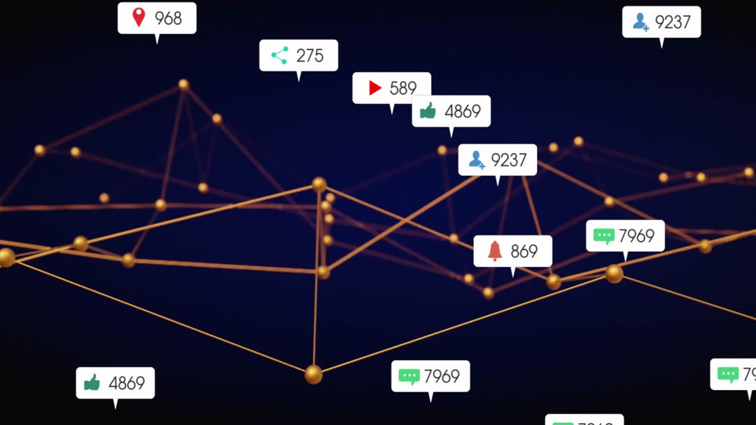 Abstract visualization showing digital engagement metrics on a network. Represents concepts like data analytics, social media metrics, and connectivity. Useful for illustrating technology, digital marketing strategies, and online interaction themes. Perfect for use in presentations, websites, or educational materials about internet analysis and technological innovation.
