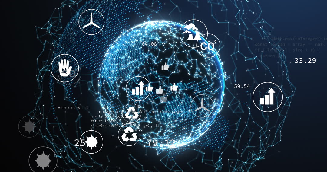 This digital artwork displays a network of glowing connections surrounding a bright globe, adorned with various icons representing recycling, metrics, and collaboration. Ideal for illustrating topics related to global communication, technological advancement, and data networks, this visual is perfect for websites, articles, or presentations focused on innovation in the technological space.