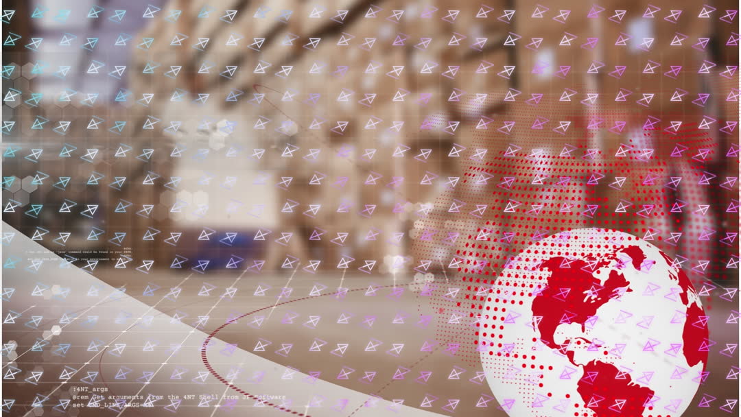 Visual representation captures digital transformation in logistics, showing network connectivity and global data exchange in a warehouse setting. Useful for illustrating themes of global communication, supply chain innovation, technological advancement, and digital logistics solutions.