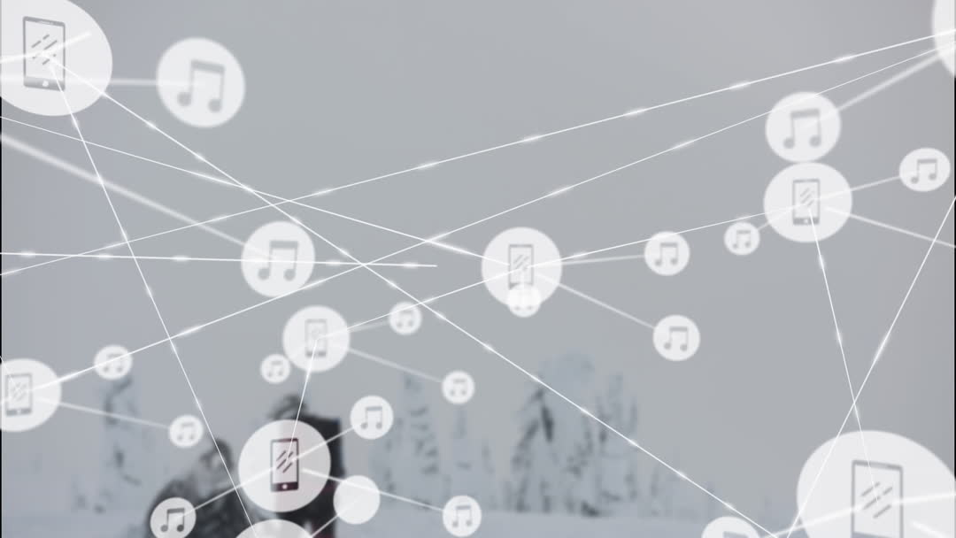 Digital Network with Music Notes and Smartphone Icons Overlaid Video