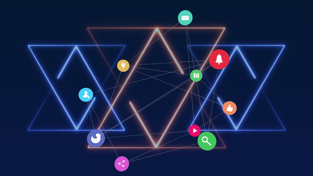 Abstract design featuring interconnected digital icons over a neon geometric background. Useful for illustrating concepts of networking, connectivity, digital communication, and modern technology applications. Perfect for technology blogs, digital marketing materials, and presentations on innovation.