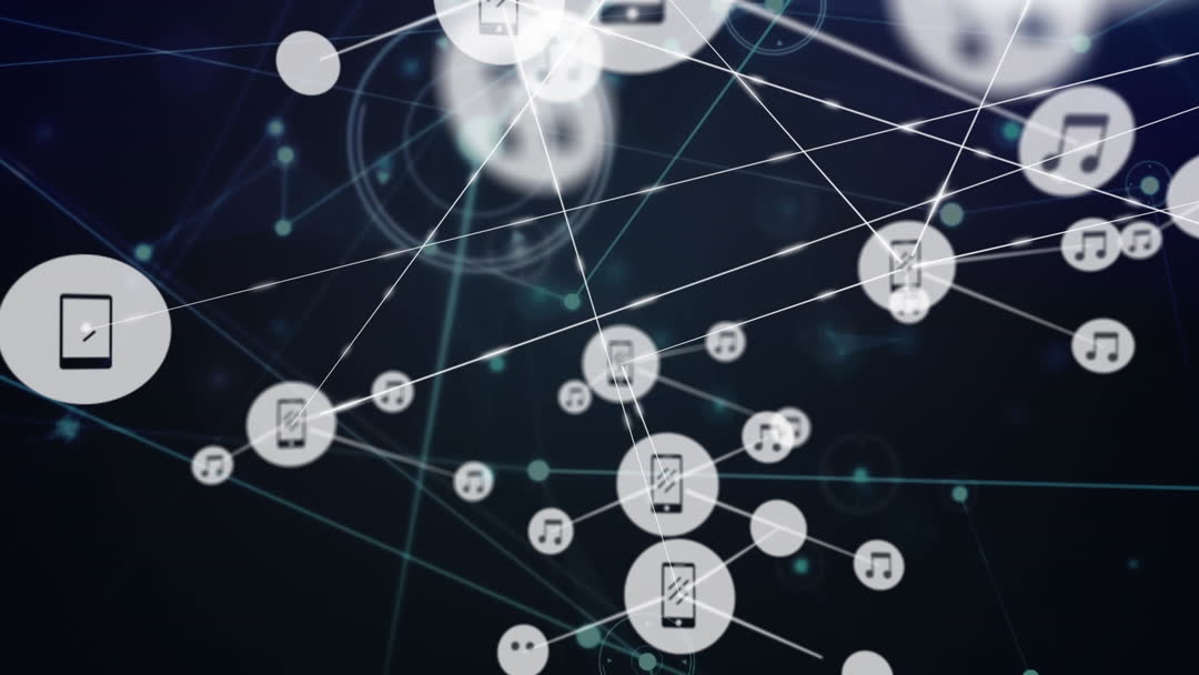 Animation features a digital network with various technology icons such as music notes, smartphones, and tablets connected by light trails against a purple background. It represents concepts like global networking, communication, internet, and digital connectivity, showcasing a futuristic virtual connection. Suitable for themes on technology advancements, digital media, and internet connectivity. Ideal for presentations, tech industry media, and education on global digital interaction.