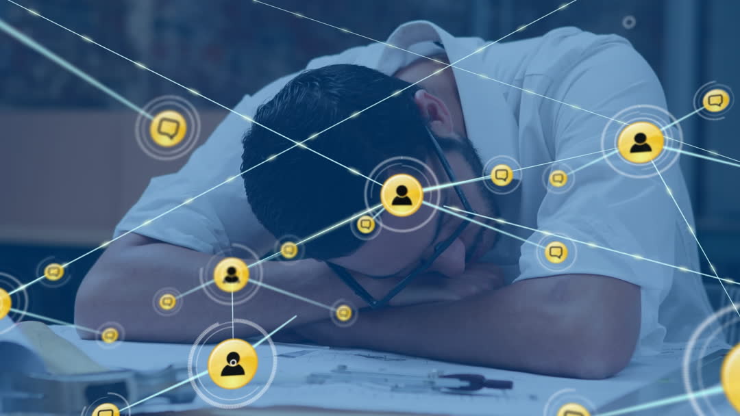 Depicts digital networks superimposed over a sleeping architect symbolizing challenges of constantly connected workplaces. Useful for illustrating concepts of globalization, remote working, career fatigue due to digitalization, and modern business practices. Ideal for articles on work-life balance, technology's impact, and innovative solutions for reducing employee burnout.