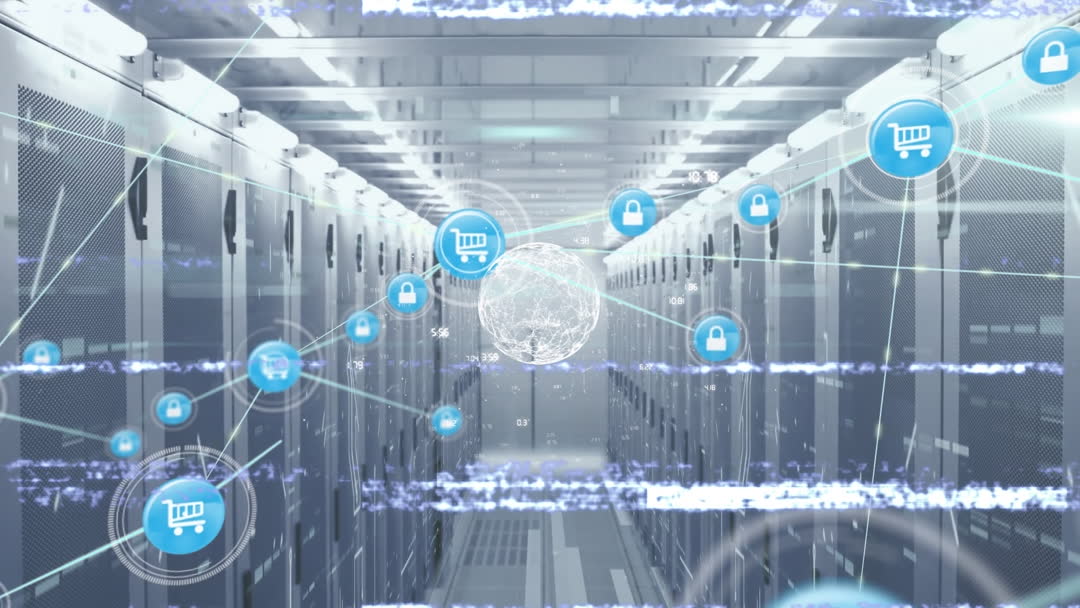 This modern visualization captures the theme of digital networking and ecommerce represented over a high-tech server room. Used by technology firms weaving elements of global connectivity, digital transactions, technology advancements, security and ecommerce landscapes, the illustrative videory suits promotional content, blog backgrounds and informational campaigns centered on technological advancements and digital marketing.