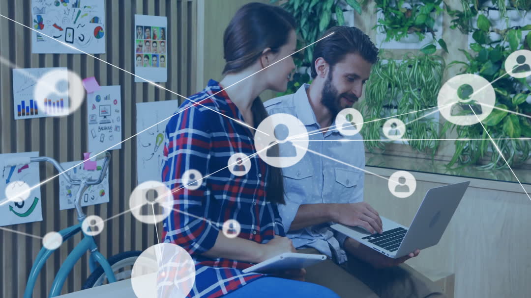 Diverse team in a modern, creative workspace discussing ideas with a laptop, interconnected by digital network icons overlay. Good for illustrating teamwork, collaboration, digital transformation, and innovation in business. Use for articles about modern office practices, remote work solutions, or teamwork technology.