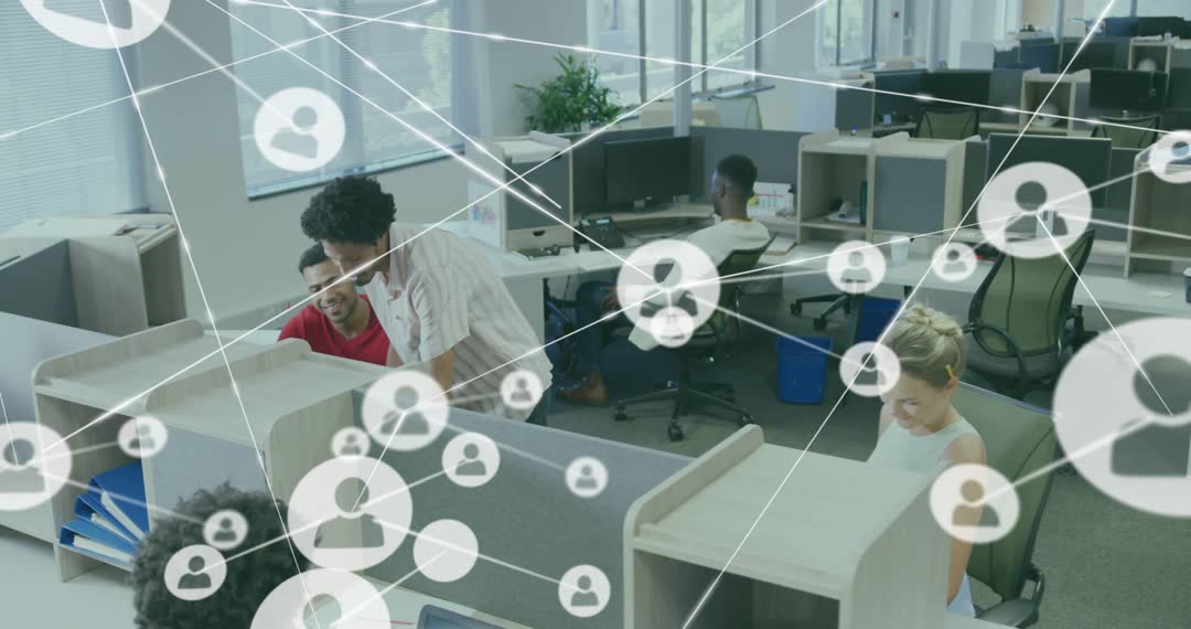 Image depicts office workers engaged in collaboration with overlaid networking icons to represent digital connectivity and communication in a professional setting. Ideal for use in business presentations, advertisements promoting digital services, articles on teamwork, or company materials emphasizing connectivity and modern workspace dynamics.