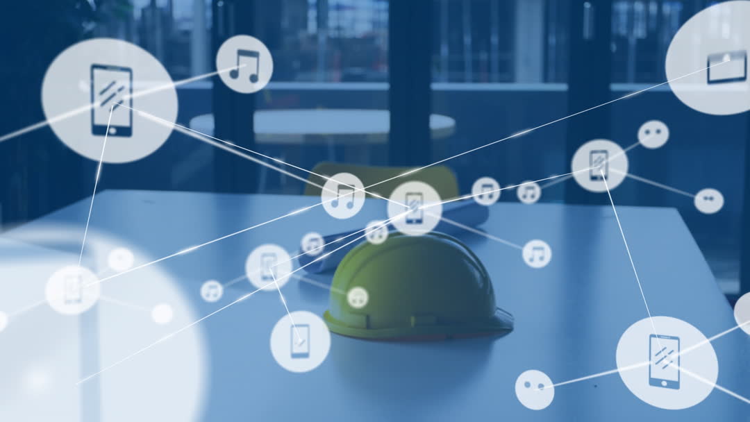 Digital overlay of network connections with smartphones and music icons over a workplace scene with a yellow hard hat and architectural sketches. This video illustrates the merging of technology with traditional industries such as construction and architecture. Useful for presentations on smart engineering solutions, teamwork in digital environments, and discussions on modern technology integrations.