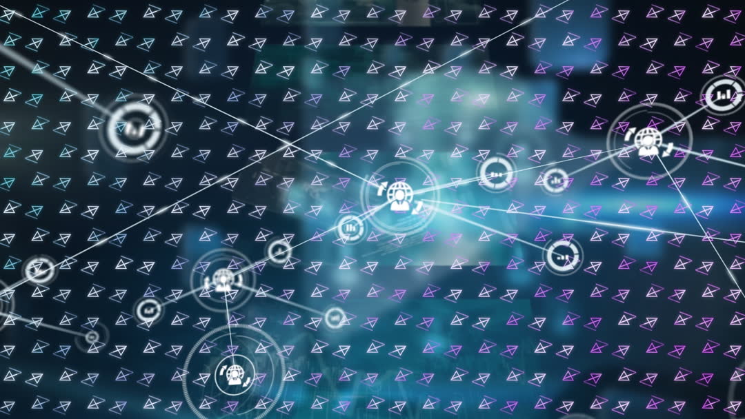 This video depicts a digital networking theme with an overlay of email icons and data symbols. The abstract shapes and patterns represent global communication and streaming data, making it suitable for use in technology articles, network security presentations, and digital communication campaigns.