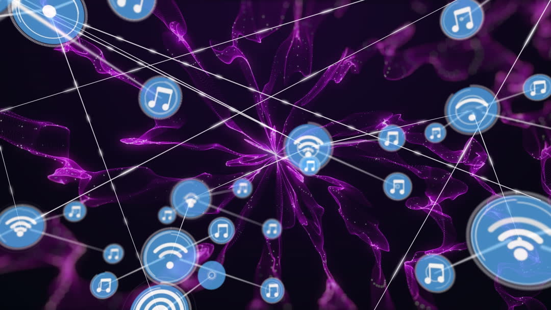 Vibrant illustration showcasing interconnected digital elements with music and Wi-Fi icons over a dynamic purple backdrop. Ideal for visuals on digital innovation, global communication, technology product advertisements, or creative content related to music streaming and data exchange.