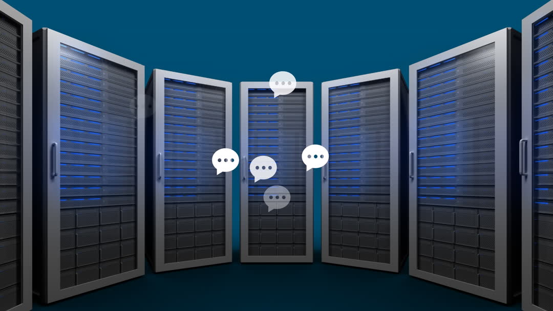 Depicts an innovative fusion of digital communication and technology represented by computer servers intersected with animated social media icons. Useful for illustrating themes of networking, data management, online connectivity, and digital communications for business, tech startups, and IT-related articles or presentations.