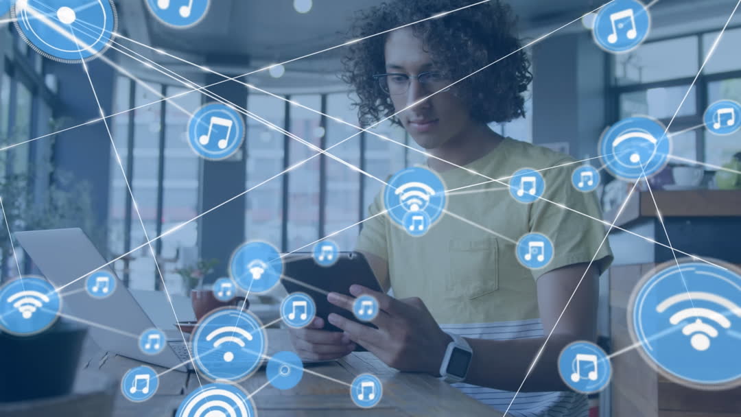 Young man using tablet in a modern cafe environment with digital icons representing network and connectivity overlay. Scene illustrates the intersection of technology in daily life, particularly among millennials. Useful for themes related to digital culture, remote work, and communication, suitable for using in articles or promotional materials about technology integration and digital lifestyles.