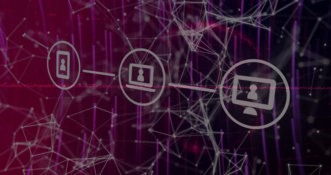This visual showcases digital icons linked in a network against an abstract purple background, symbolizing modern communication and technology. Ideal for use in presentations or content related to digital business solutions, global connectivity, or innovative technological concepts.