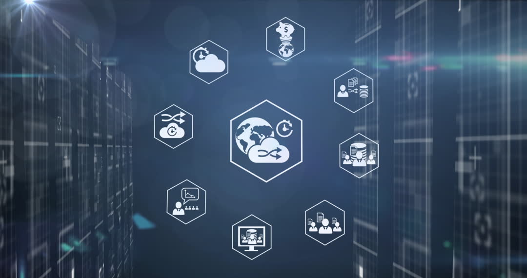 Visualization depicting digital connectivity and networking concepts through the use of icons and abstract data videory. Useful for technology presentations, business networking discussions, and visualization or teaching materials related to cloud computing and digital infrastructure.