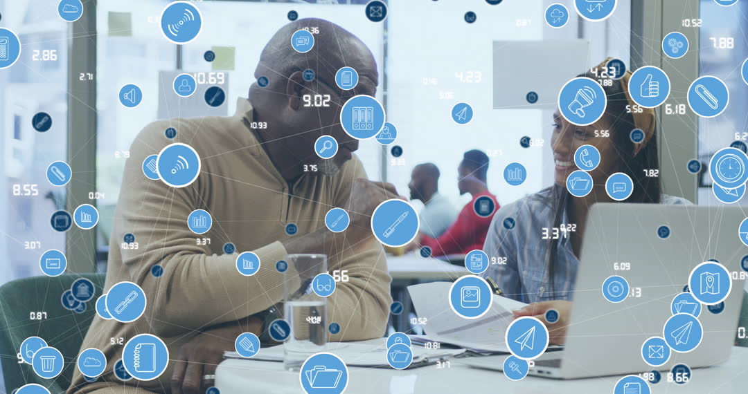 Diverse man and woman collaborating in office with a network of digital icons overlay interacting their discussion. Suitable for illustrating concepts of global networking, modern business communication, and innovation in technology. Ideal for use in content related to technological advancements, collaborative workspaces, and business innovation.