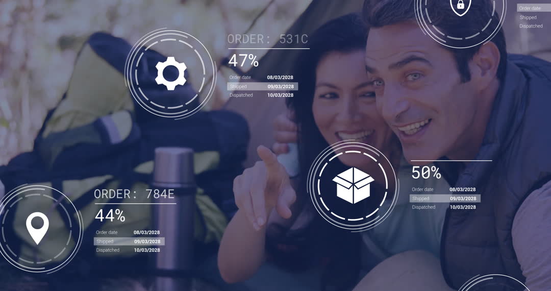 Visual displays digital icons and statistics, depicting futuristic order tracking amid an outdoor setting with figures camping. Suitably used for illustrating themes of logistics tech integration, database management, and innovative networking in marketing campaigns focusing on technology in outdoor experiences.