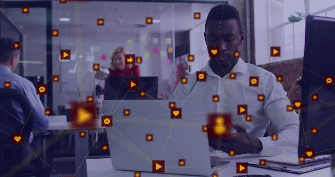 African American businessman seated at office desk engaging with digital social media icons overlay. Depicts connectivity in modern work environment. Ideal for technology, communication strategy, and social networking presentations.