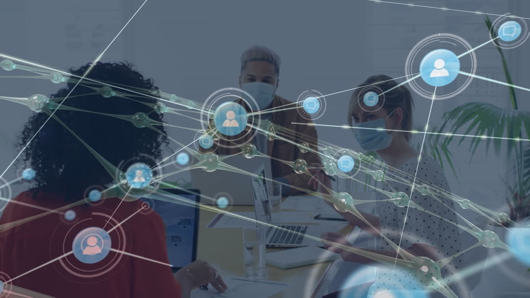 This video shows colleagues at a business meeting wearing masks, highlighting connections through a digital network overlay. Useful for topics on remote work, digital communication, and workplace safety during the pandemic. It illustrates teamwork and the importance of technology in modern business settings.