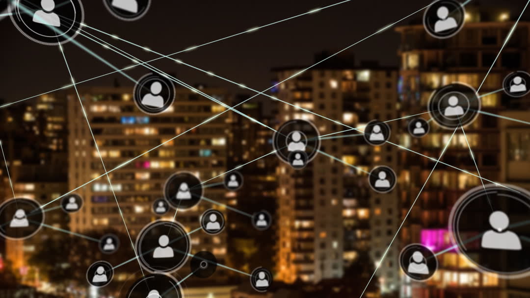 Image depicts digital networking with profile icons connected across a cityscape at night, conceptualizing global communication and technology. Ideal for illustrating business, technology, social media, and networking themes, suitable for presentations, web design, and educational materials.