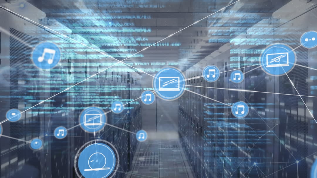 Blurred background featuring a server room with layers of abstract graphics, highlighting digital connectivity through icons representing streaming media and data movement. Lines interconnect nodes, emphasizing global data exchange. Useful for illustrating technology concepts, digital communications, data processing, and modern IT infrastructure.