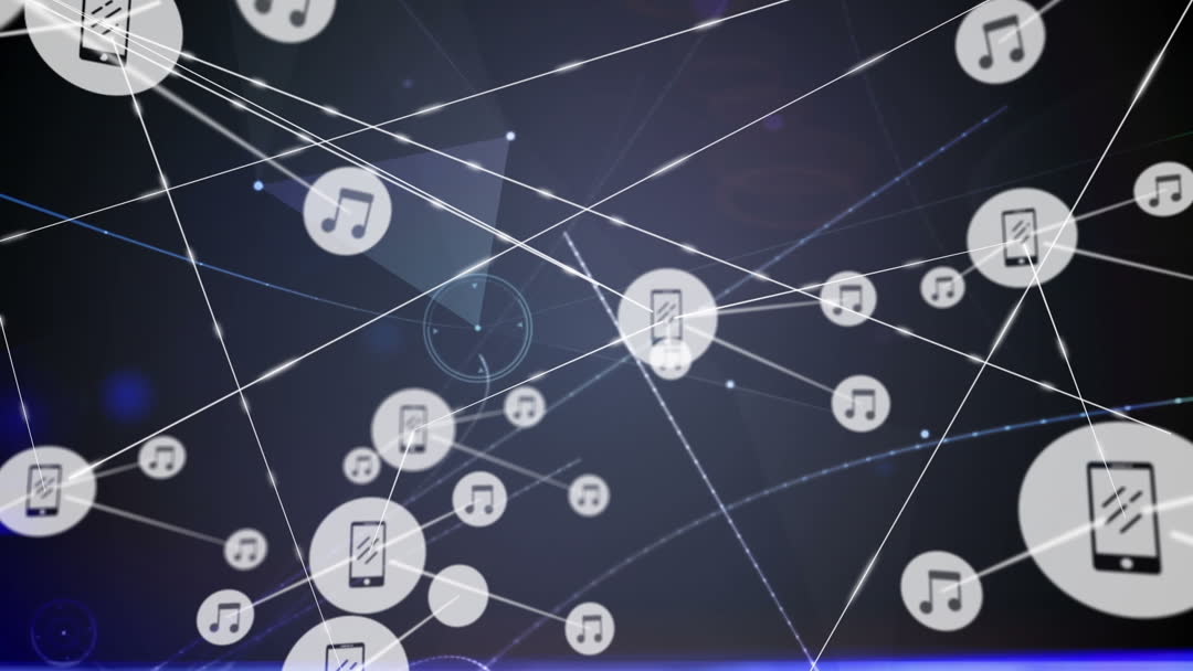 Displays digital networking theme with interconnected mobile and music icons symbolizing data transfer and communication technology. This is suitable for illustrating modern telecommunications, digital interfaces, online connectivity, or promoting software applications and tech services. Ideal for use in technology blogs, digital marketing materials, or educational content about virtual networking.