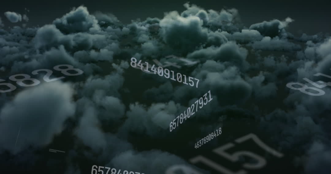 Dynamic visual showing numbers seamlessly flowing through clouds symbolizes modern cloud computing and data analysis. Suitable for projects about digital security, cloud data processing, or technology advancements. Excellent for use in tech conferences, digital animations, or internet safety campaigns.
