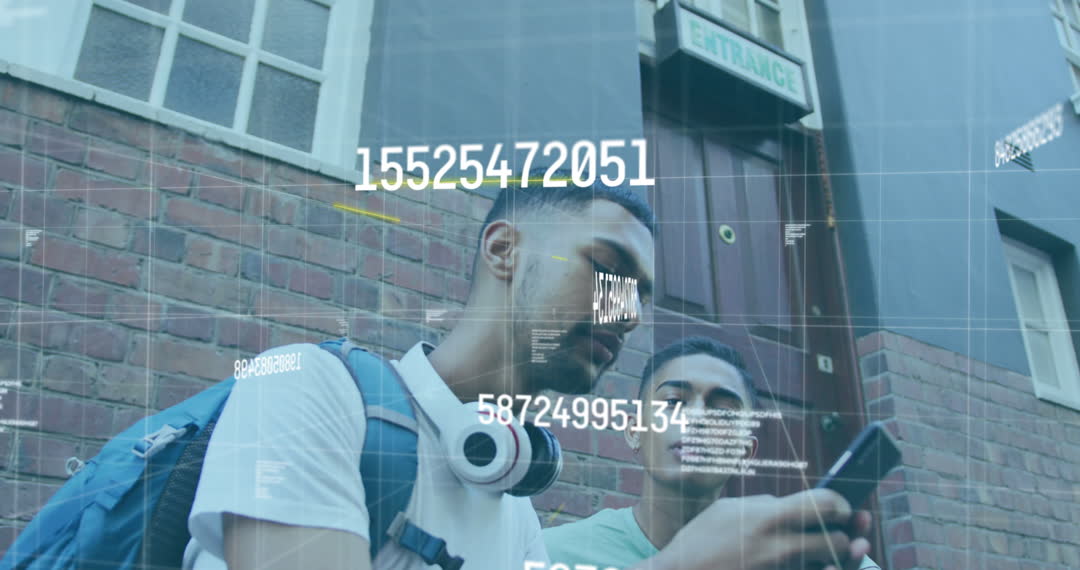 Two young men use a smartphone as digital data floats over them, illustrating themes of connectivity and tech communication. Great for projects about social media, technology, and modern communication.