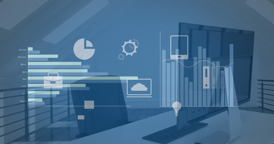 Modern workspace showing a desktop computer with animated graphs and technological icons. Suitable for business and technology related projects that highlight data analytics, modern office environments, and digital solutions. Ideal for presentations, websites, and marketing materials showcasing innovative business ideas.