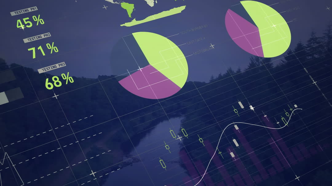 Visual presentation combines technology and nature by overlaying animated financial data elements on a natural backdrop. Includes pie charts, line graphs, and analytics patterns. Useful for conveying concepts of environmental data usage, tech integration with the natural environment, or innovative financial analytics.