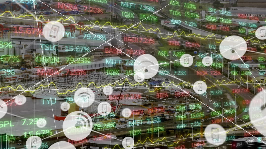 The video seamlessly blends financial metrics and digital network graphics atop a harbor scene, representing the interconnectedness of global trade and finance. Ideal for illustrating concepts in business analytics, economic reports, international trade courses, or financial technology articles. Such visuals highlight the integration of traditional and digital economies.