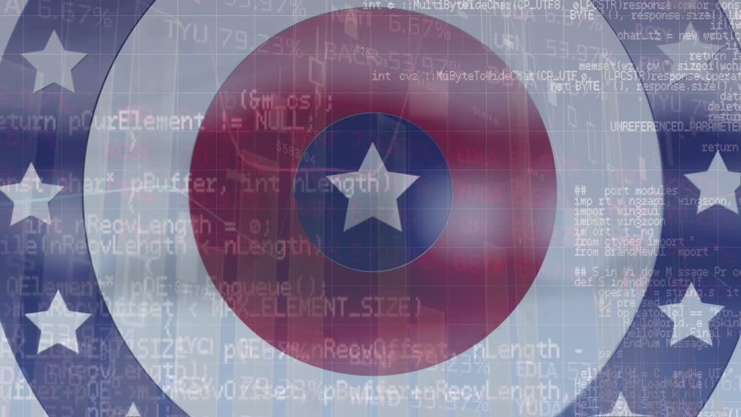 Circular star design is superimposed over digital code emphasizing connections between global data processing and patriotic themes. This is suitable for subjects involving data technology, national technology trends, or discussions about country-focused IT security systems.