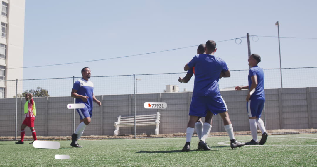 Digital Overlay on Diverse Male Soccer Players Celebrating on Field Video