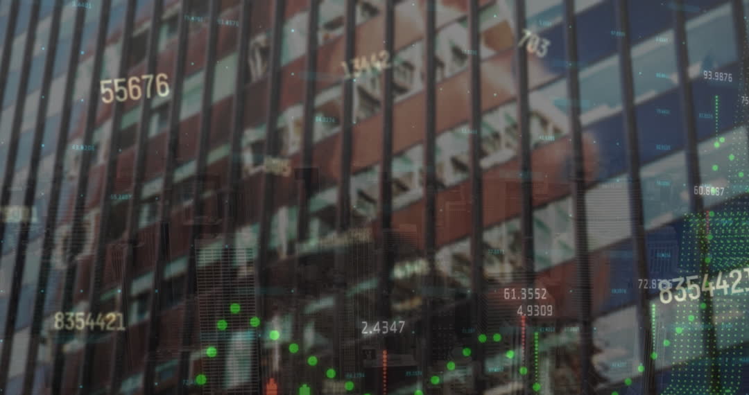 - Digital Overlay on Modern Office Building Boosting Economic Insights