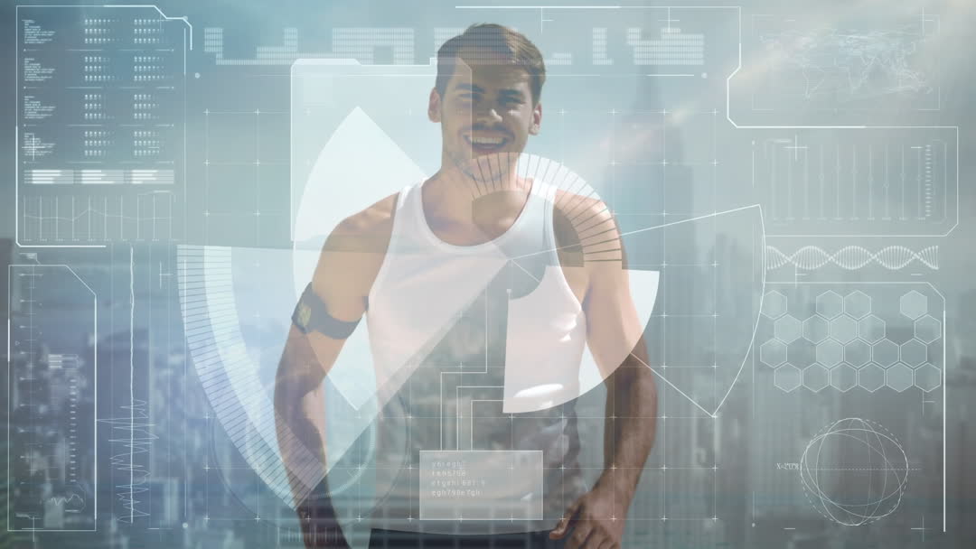 - Digital Overlay on Smiling Man with Fitness Data Visualization