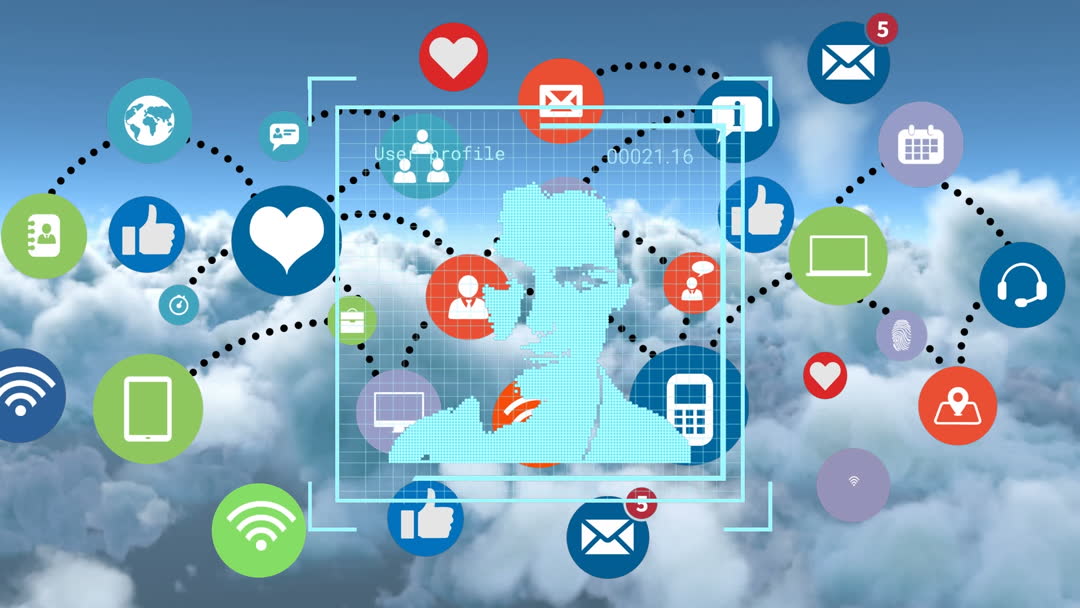 The design showcases a digital interface featuring various multimedia icons overlaying wispy clouds, emphasizing concepts like global connectivity and information exchange. It's valuable for illustrating digital communication infrastructure, modern networking apps, or tech business presentations.