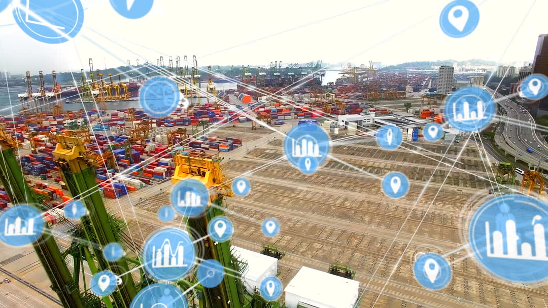 Graphic showcases a commercial shipping port overlaid with digital icons and connection lines, signifying technological integration in logistics. Useful to illustrate smart port operations, enhance digital advertisements for maritime businesses, and educate on modern logistics and trade infrastructure.